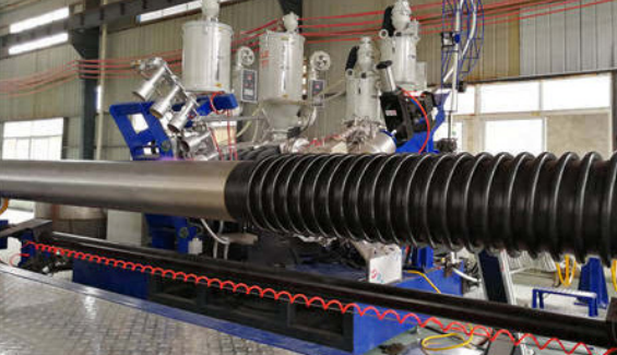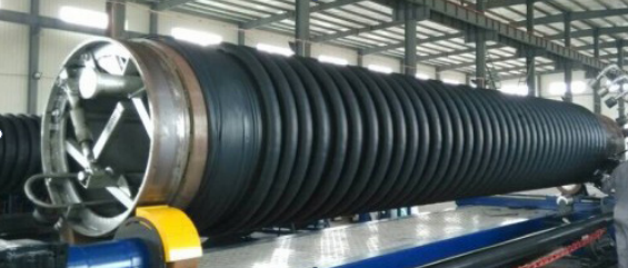 聚乙烯纏繞管是采用高密度聚乙烯 (HDPE) 為原料,添加 1.5-2% 的色母粒,通過兩臺單螺桿擠出機(jī)擠到成型內(nèi)模上,將方管纏繞到內(nèi)模上(內(nèi)模為轉(zhuǎn)動的),兩道方管之間再擠上 HDPE 料,將兩道方管熔合起來,外加滾輪將熔合料壓平,再通過噴水冷卻,切割成管。其優(yōu)點是管徑大,可生產(chǎn)直徑達(dá) 3000mm 的管材,耐腐蝕,不結(jié)垢,壽命長達(dá) 50 年,生產(chǎn)設(shè)備投入小,但生產(chǎn)速度慢 , 生產(chǎn)成本較高。